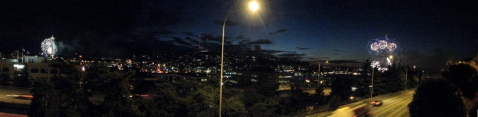 I spent happy hour on Friday, July 4th at the Bottleneck Lounge before heading back to Capitol Hill and Melrose Avenue to watch the fireworks. Above: A panorama where you can see both the Fourth of Jul-Ivars fireworks over Elliott Bay and behind the Space Needle as well as the WaMu Family 4th over Lake Union. This view is about 110º wide...